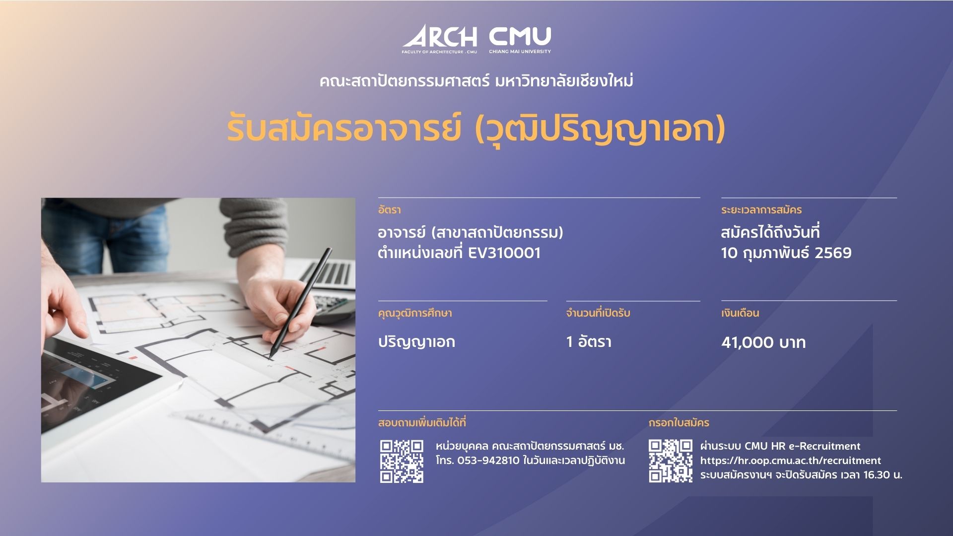 คณะสถาปัตยกรรมศาสตร์ รับสมัครบุคคลที่มีคุณวุฒิระดับปริญญาเอก เพื่อคัดเลือกและบรรจุเป็นพนักงานมหาวิทยาลัย ตำแหน่ง อาจารย์ (สาขาสถาปัตยกรรม) จำนวน 1 อัตรา อัตราเลขที่ EV310001 อัตราเงินเดือน 41,000 บาท โดยผู้สมัครจะต้องมีคุณสมบัติและเอกสารประกอบการสมัครครบถ้วนตามประกาศคณะฯ ที่แนบมาพร้อมนี้