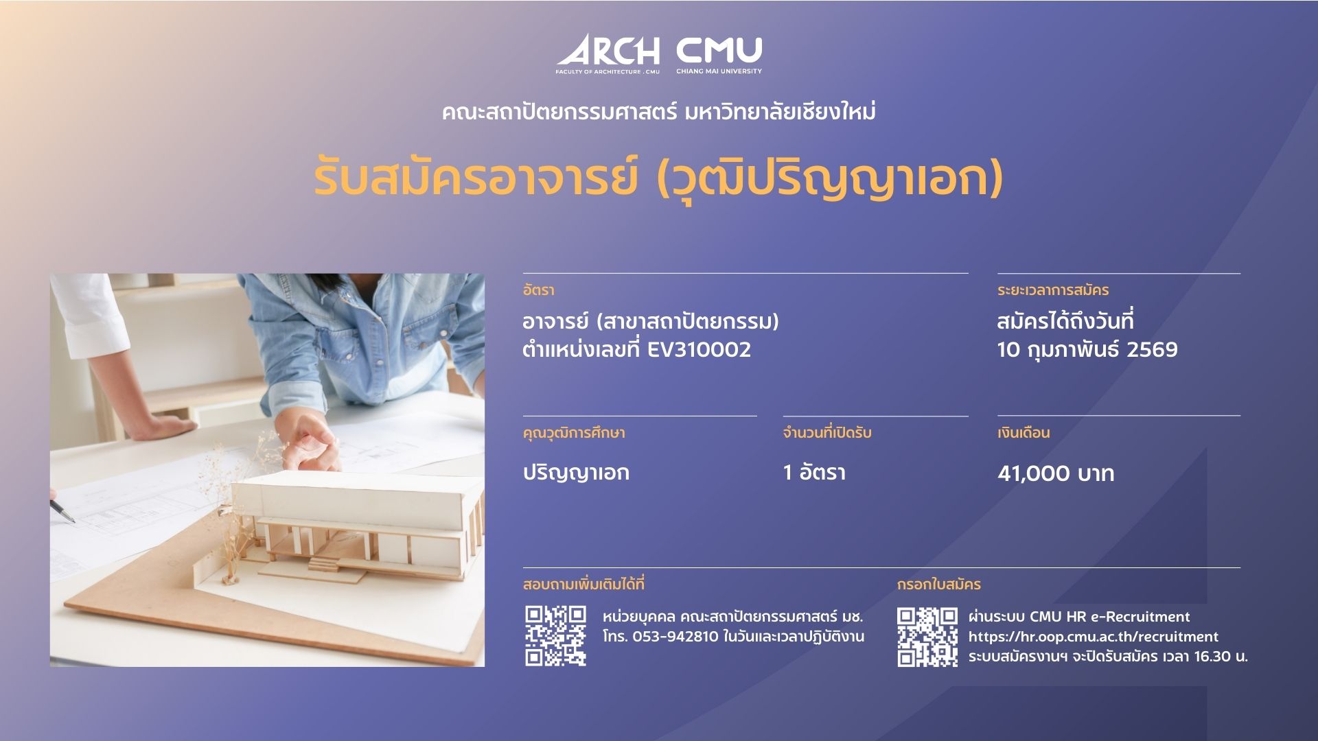 คณะสถาปัตยกรรมศาสตร์ รับสมัครบุคคลที่มีคุณวุฒิระดับปริญญาเอก เพื่อคัดเลือกและบรรจุเป็นพนักงานมหาวิทยาลัย ตำแหน่ง อาจารย์ (สาขาสถาปัตยกรรม) จำนวน 1 อัตรา อัตราเลขที่ EV310002 อัตราเงินเดือน 41,000 บาท โดยผู้สมัครจะต้องมีคุณสมบัติและเอกสารประกอบการสมัครครบถ้วนตามประกาศคณะฯ ที่แนบมาพร้อมนี้