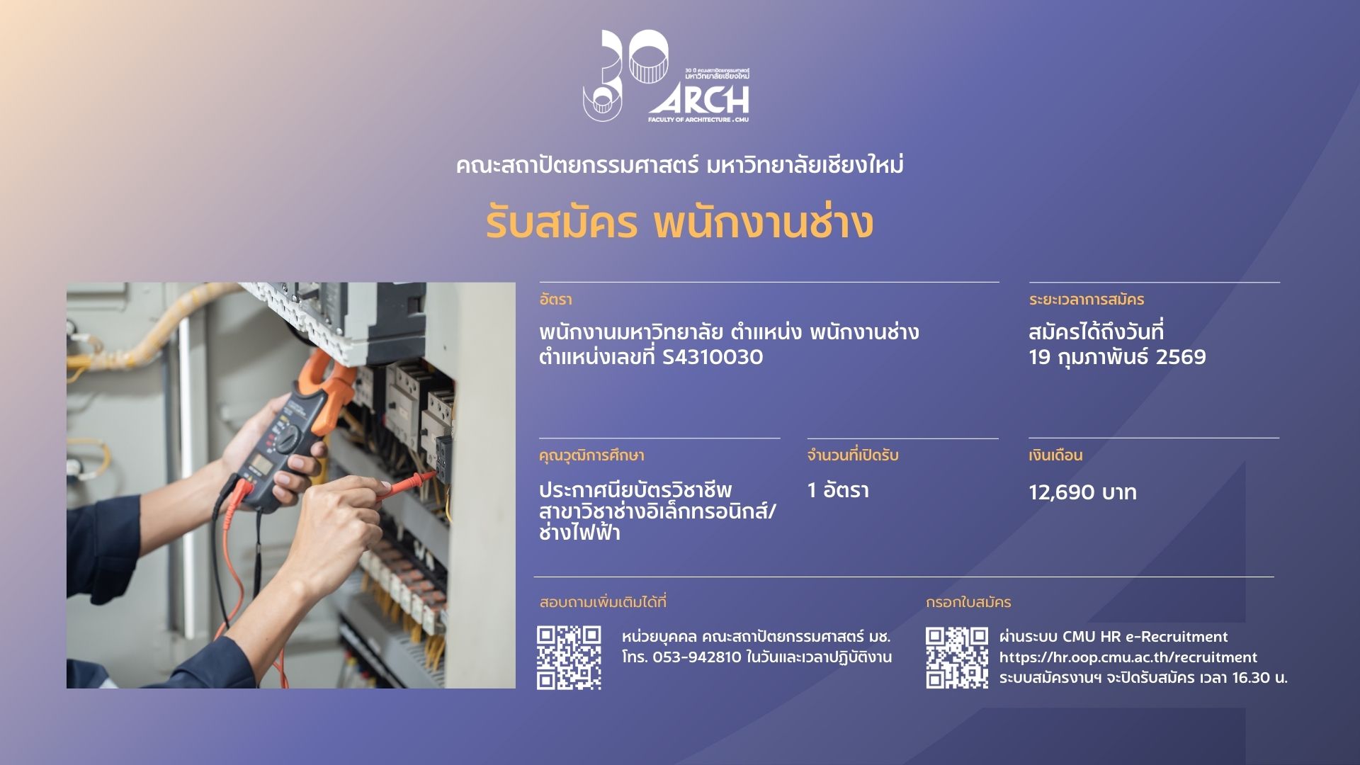 คณะสถาปัตยกรรมศาสตร์ มหาวิทยาลัยเชียงใหม่ เปิดรับสมัครบุคคลที่มีคุณวุฒิระดับประกาศนียบัตรวิชาชีพ สาขาวิชาช่างอิเล็กทรอนิกส์ และช่างไฟฟ้า เพื่อเข้ารับการคัดเลือกและบรรจุเป็นพนักงานมหาวิทยาลัย ตำแหน่ง พนักงานช่าง อัตราเลขที่ S4310030 อัตราเงินเดือน 12,690 บาท โดยผู้สมัครจะต้องมีคุณสมบัติและเอกสารประกอบการสมัครครบถ้วนตามประกาศคณะฯ ที่แนบมาพร้อมนี้