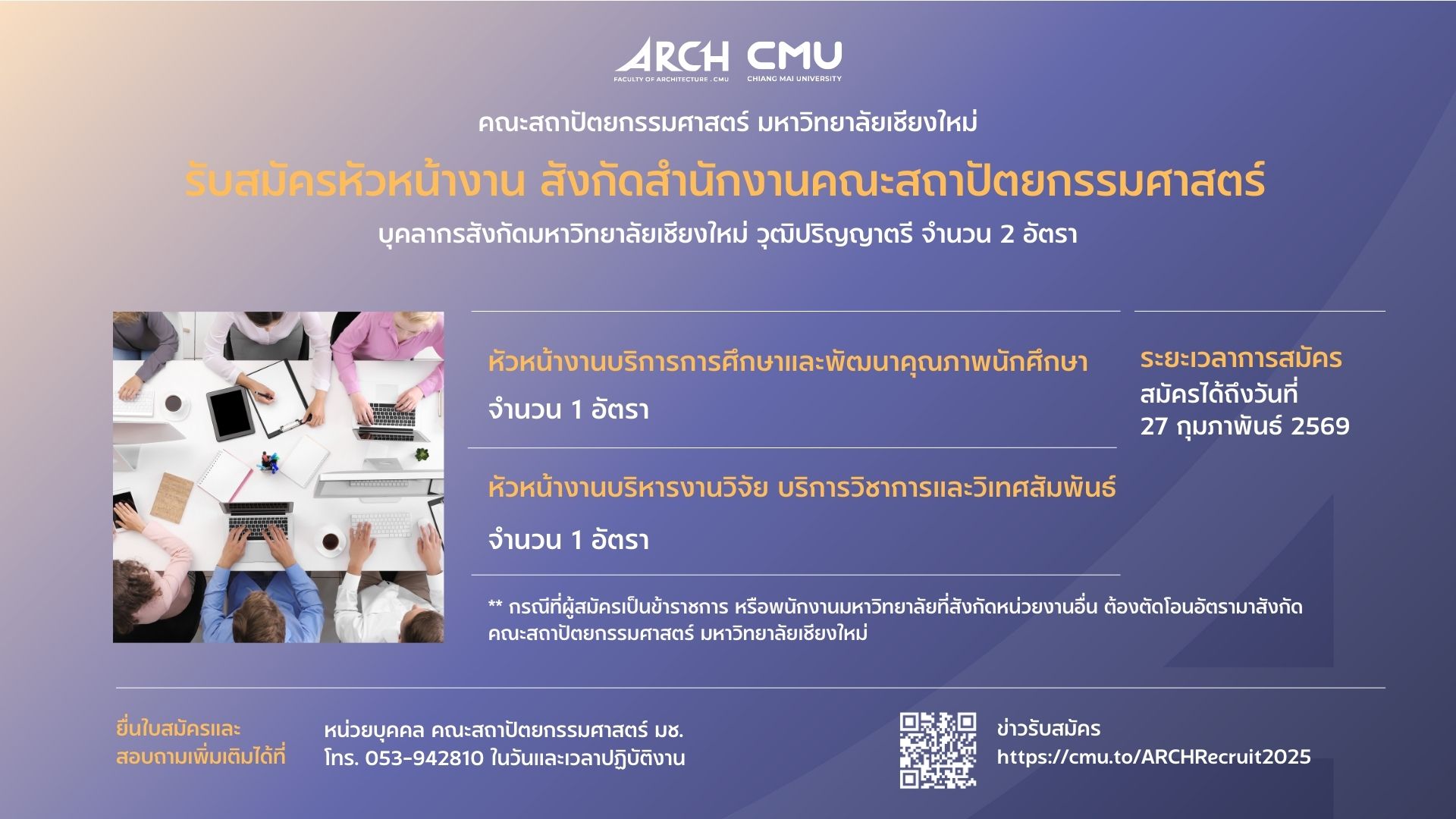 คณะสถาปัตยกรรมศาสตร์ เปิดรับสมัครบุคลากรสังกัดมหาวิทยาลัยเชียงใหม่ เพื่อคัดเลือกให้ดำรงตำแหน่งหัวหน้างานบริการการศึกษาและพัฒนาคุณภาพนักศึกษา สังกัดสำนักงานคณะสถาปัตยกรรมศาสตร์