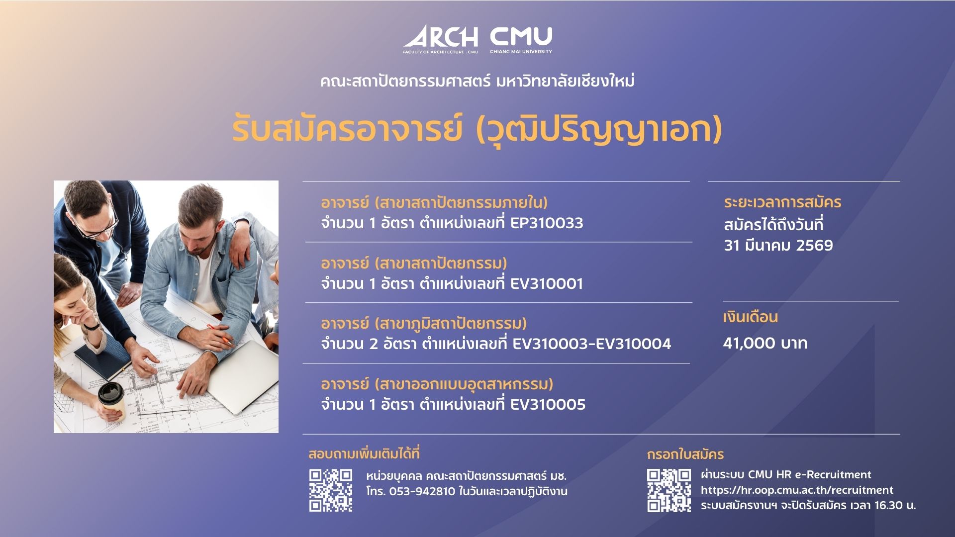 คณะสถาปัตยกรรมศาสตร์ รับสมัครบุคคลที่มีคุณวุฒิระดับปริญญาเอก เพื่อคัดเลือกและบรรจุเป็นพนักงานมหาวิทยาลัย ตำแหน่ง อาจารย์ (สาขาภูมิสถาปัตยกรรม) จำนวน 2 อัตรา อัตราเลขที่ EV310003-EV310004 อัตราเงินเดือน 41,000 บาท โดยผู้สมัครจะต้องมีคุณสมบัติและเอกสารประกอบการสมัครครบถ้วนตามประกาศคณะฯ ที่แนบมาพร้อมนี้
